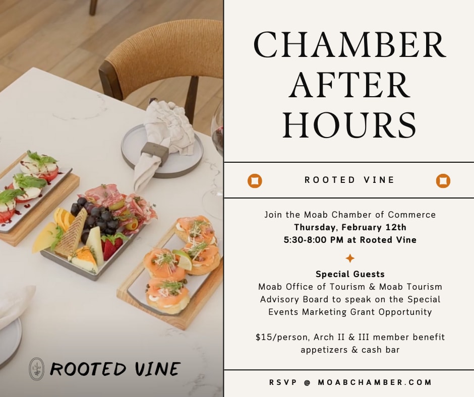 This month, we are highlighting the work of the Moab Office of Tourism and the Moab Tourism Advisory Board. Join us to receive an update on the Special Event Marketing Grant and other opportunities available to you this year. This brief presentation will be followed by time to mingle with fellow business leaders and community members.